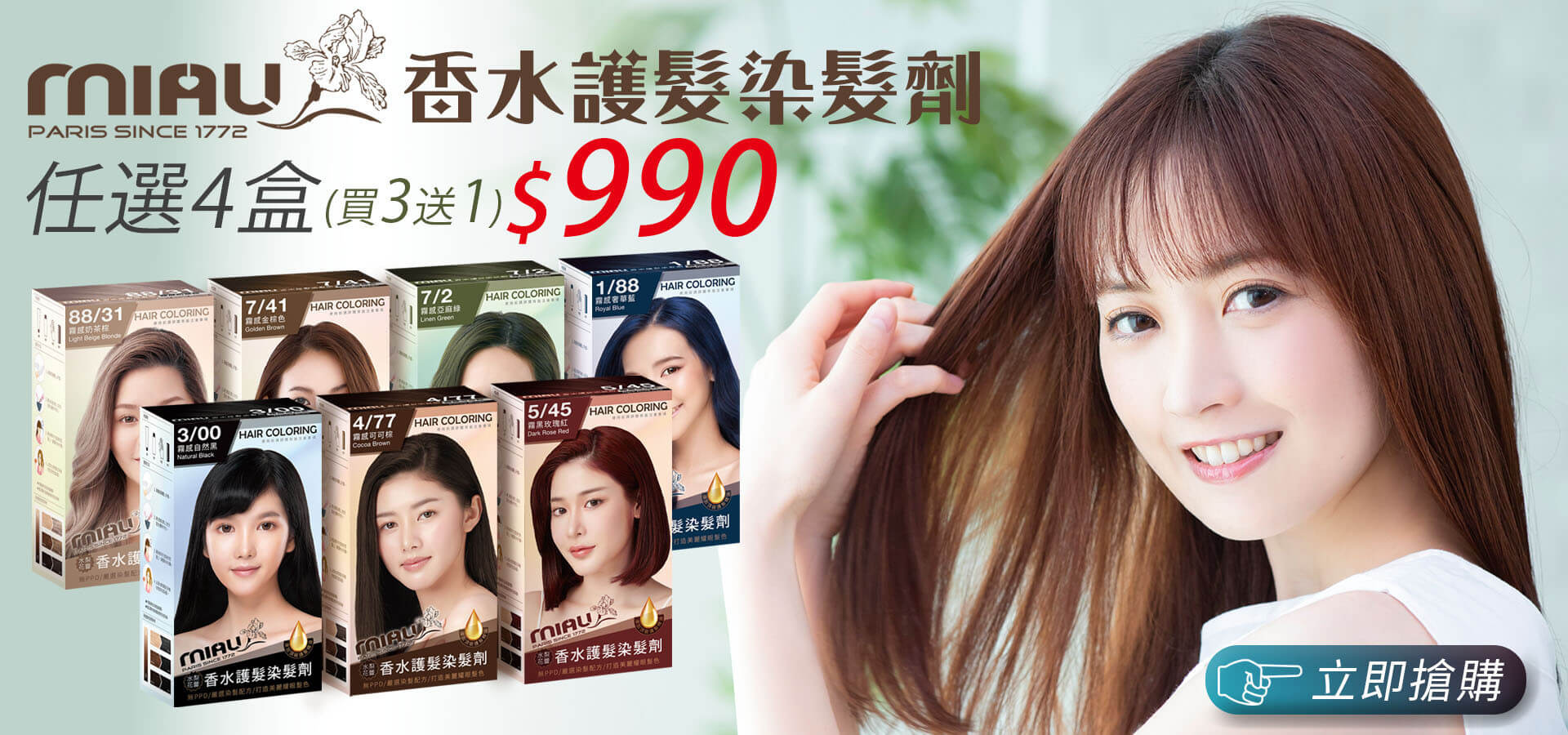 MIAU-香水護髮染髮劑【買3送1】不含PPD/香水染髮/不刺激/染髮兼護髮 顏色持久完美遮蓋,時尚好氣色/單盒$399/【任選4盒$990】$690$399